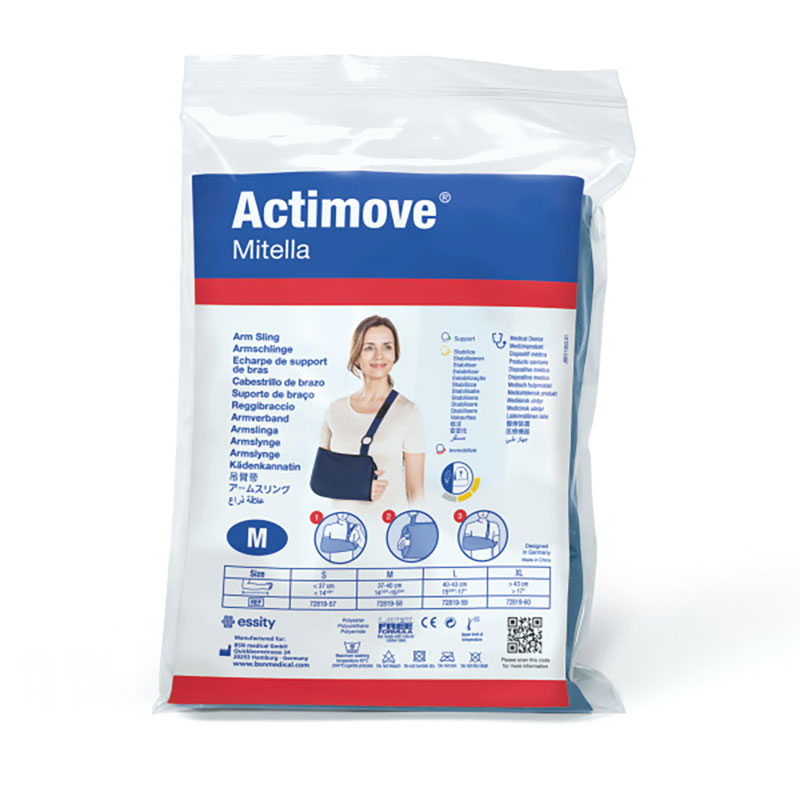 Actimove Mitella Eco Armslinga – en lätt armslinga med kardborre, mjuk nackrem och inbyggd tumögla som stödjer armen vid traumaskador, mjukelsskador och neurologiska tillstånd, finns i fyra storlekar.