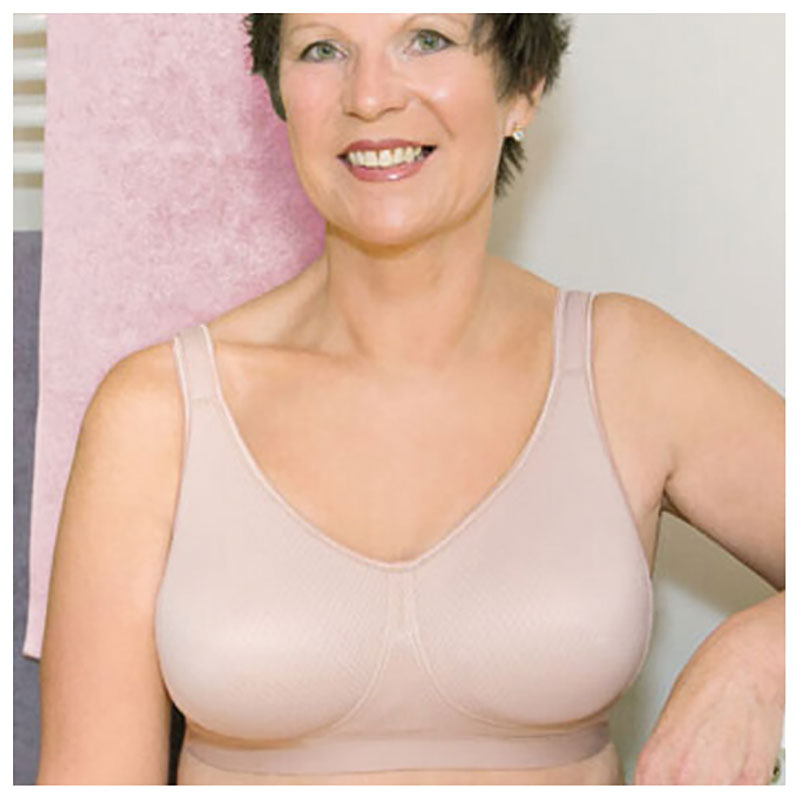 Camp Scandinavia Massage BH beige – en bekväm protes-bh i beige mikrofiber med sömlösa kupor och protesfickor, samt masserande effekt som främjar lymfflödet vid lymfödem. Camp Scandinavia har utvecklat denna bh med inbyggda fickor för bröstprotes.