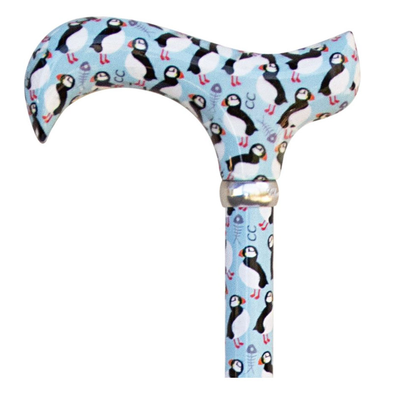 Classic Canes käpp med derby handtag finns i två handmålade motiv som Charlotte Gillan har designat. Du väljer mellan Kungsfiskare, med färgglada kungsfiskare och kavelsäv på en himmelsblå bakgrund, eller Lunnefågel med svartvita lunnefåglar och fiskben mot ljusblått. Käppen har också en kompakt inställning på 64 cm, vilket gör den enkel att förvara när du inte använder den.