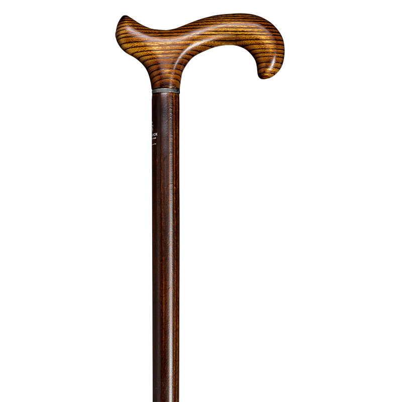 Akaciaträts naturliga ådring lyfts samtidigt fram av flambehandling och betsning, vilket gör att varje Gastrock derby promenadkäpp får ett unikt mönster. Derbyhandtaget ligger även stadigt i handen och fördelar trycket jämnt över handflatan, medan den dekorativa svartkromskragen ger den exklusiva detaljen mellan handtag och käpprör.