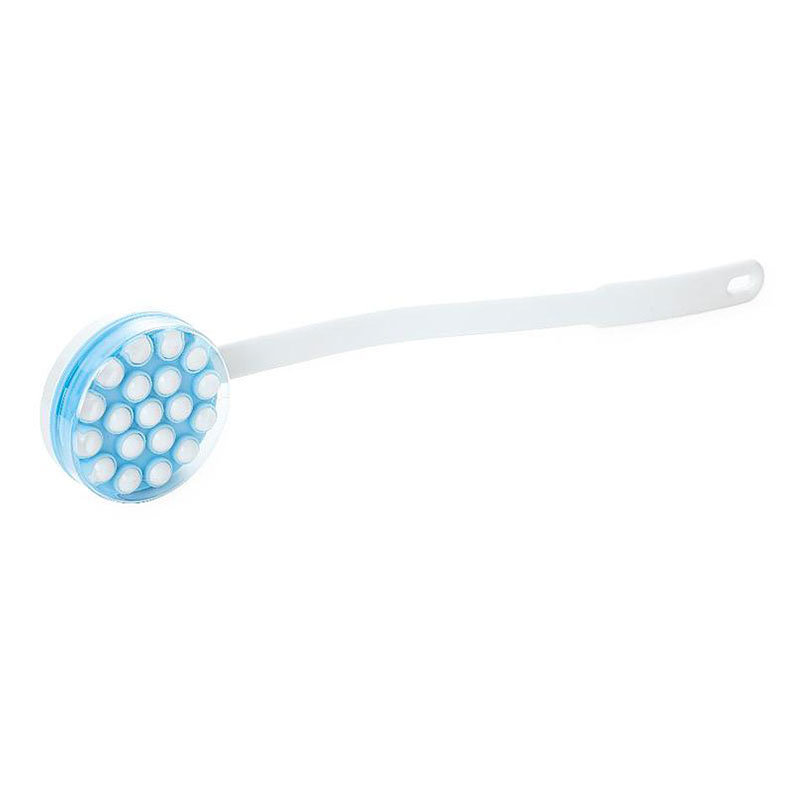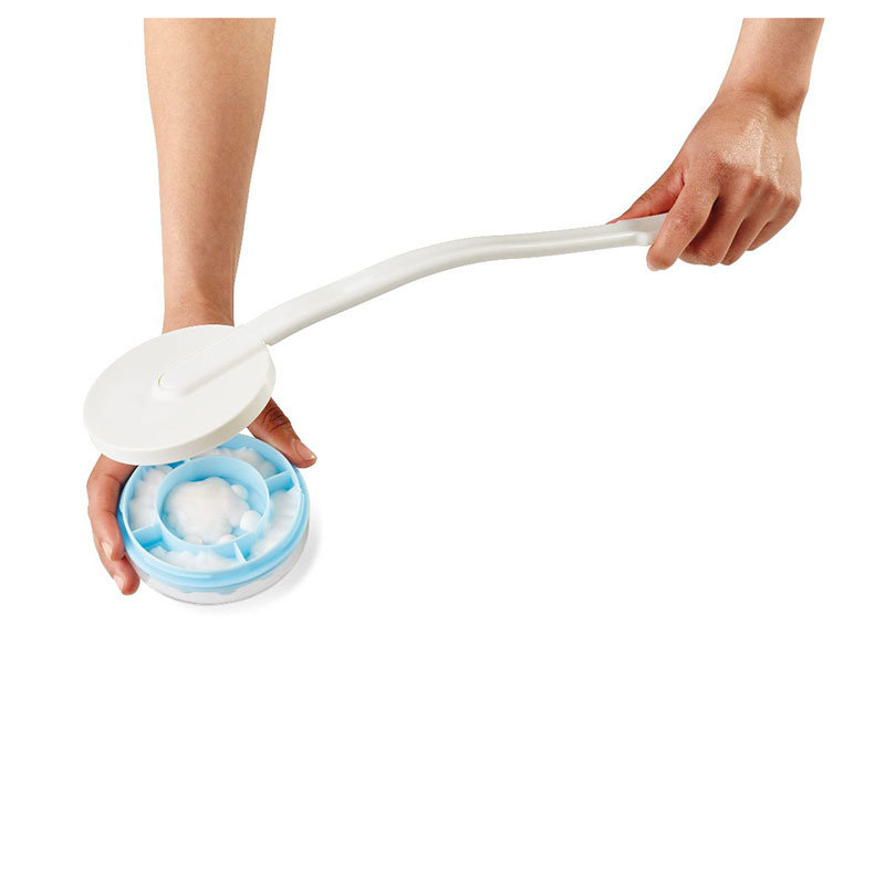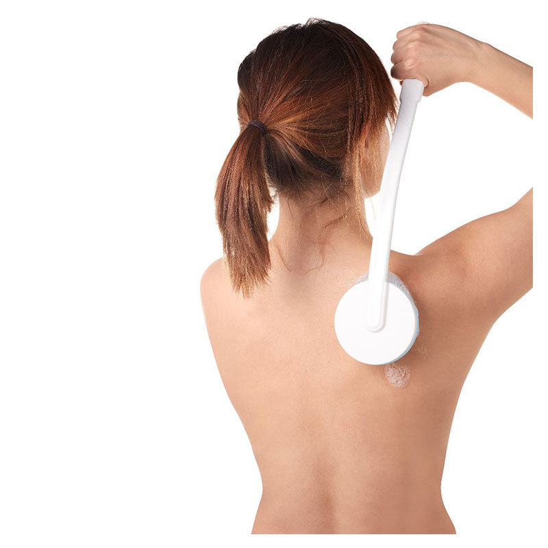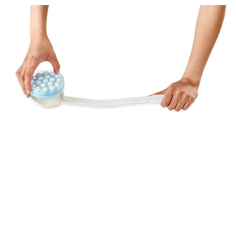 Handtaget är tillräckligt långt för att du ska kunna nå ryggen, smalbenen och fötterna utan att böja dig. Ytan har små kulor som roterar när du gnuggar, vilket ger en lätt massageeffekt samtidigt som du tvålar in eller smörjer.