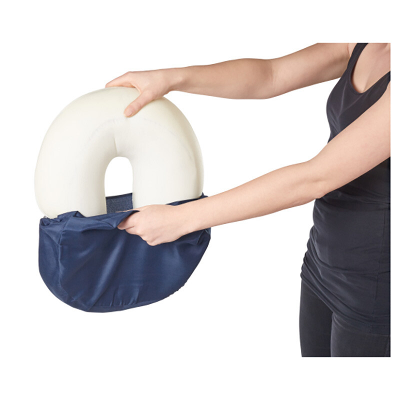 Den ovala formen och den centrala öppningen avlastar svanskotan, ändtarmen och underlivet medan du sitter på en stol, i bilen eller på toalettsitsen. Den mjuka skumkärnan ger en bekväm sits även under längre stunder vid skrivbordet eller i fåtöljen, och det mörkblå tygöverdraget gör sittringen diskret nog att placera på vilken stol som helst utan att den syns.